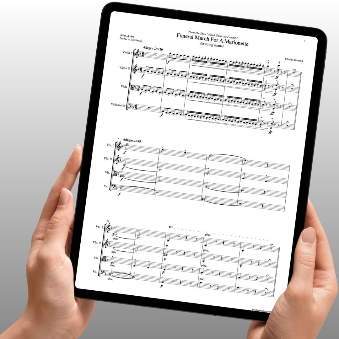 This adaptation of Funeral March Of A Marionette takes Charles Gounod’s haunting 1872 piano original and transforms it into a dynamic piece for strings. While Gounod originally wrote the piece as a tongue-in-cheek parody (the storyline includes the funeral procession pausing for the mourners to grab refreshments!), it was fate that tied it to the Master of Suspense.