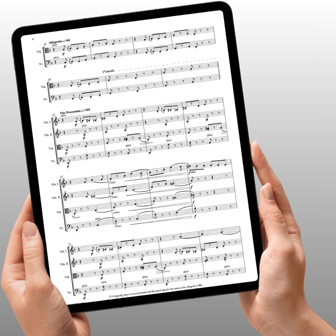 - Instrumentation: Full Score and separate parts for Violin I, Violin II, Viola, and Cello.
